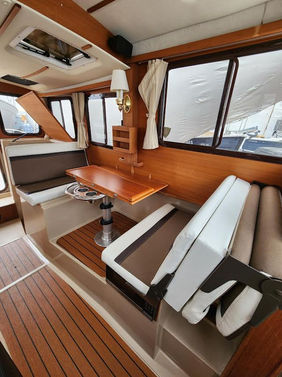 The R-27 has nearly 50 Sq ft of aft deck space allowing for easy access to the standard 200 HP Volvo diesel while keeping engine noise out of the cabin. The well appointed cabin has a midship office with desk and seat, this space also converts to a berth that sleeps two. The dinette table is on a hydraulic piston that allows for an easy conversion to a berth or lounging area. The spacious front v-berth sleeps two adults and is over 6'5" in length. Cooks will love the standard galley which includes a sink, refrigerator, inverter, microwave and a combination propane stove/oven. The marine head is standard with an electric flush toilet, glass vessel sink and shower.